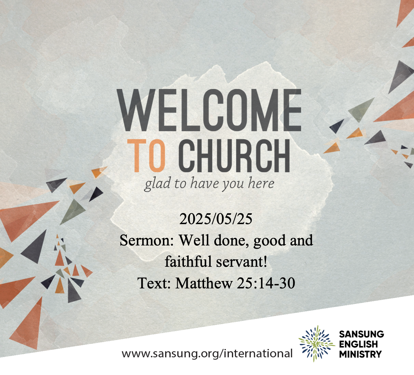 Welcome to Sansung English Ministry! We are an English/Korean speaking church that gathers to experience God and community (onsite and online). Our goal is Love God, Love Others and Serve the World.